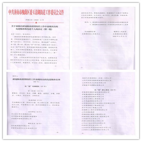 我公司——山東興田陽(yáng)光智能裝備股份有限公司,因在新冠肺炎疫情防控工作中表現(xiàn)突出,被槐蔭區(qū)玉清湖街道評(píng)為“新冠肺炎疫情防控工作表現(xiàn)突出的先進(jìn)集體”,并被授予“抗‘疫’先鋒團(tuán)隊(duì)”榮譽(yù)稱號(hào)。