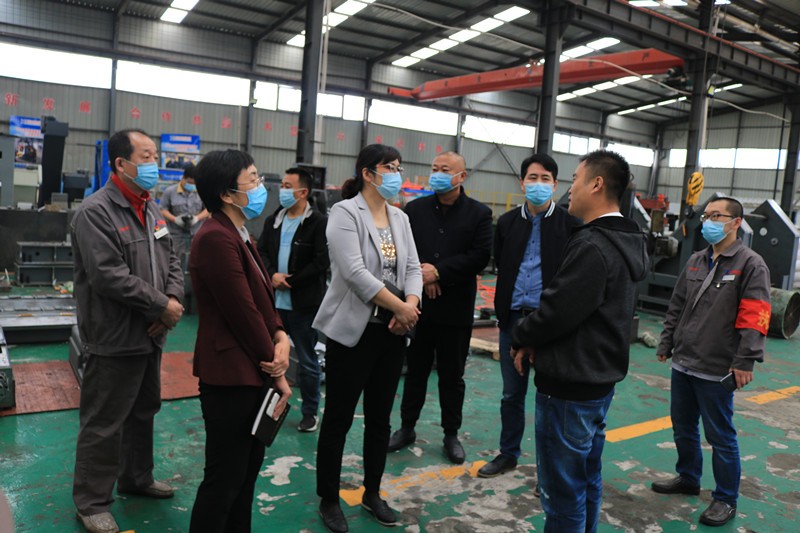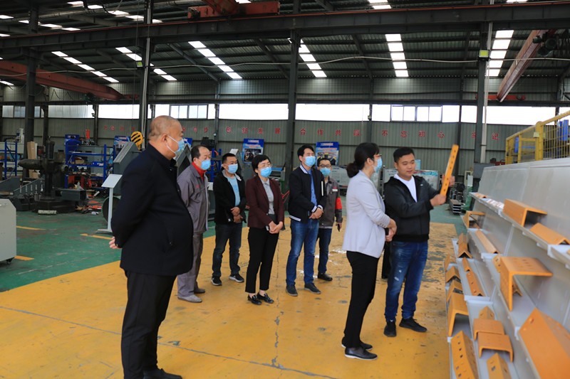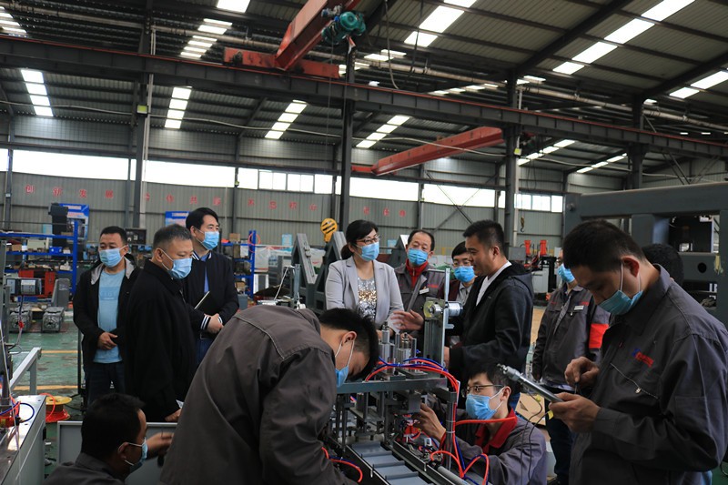 逯明書(shū)記一行首先來(lái)到了生產(chǎn)車間,現(xiàn)場(chǎng)考察企業(yè)在常態(tài)化疫情防控下的復(fù)工復(fù)產(chǎn)情況和面臨的困難。在裝配調(diào)試區(qū),逯書(shū)記詳細(xì)了解了一拖二全自動(dòng)口罩機(jī)、高速數(shù)控角鋼鉆孔生產(chǎn)線、新型高速數(shù)控角鋼沖孔打字剪切生產(chǎn)線等設(shè)備的裝配調(diào)試情況和生產(chǎn)過(guò)程中遇到的困難。