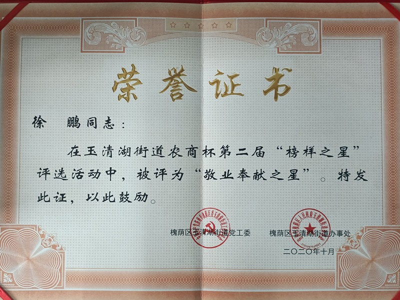 為進(jìn)一步培育和踐行社會主義價值觀,弘揚(yáng)正氣、傳承美德,發(fā)揮先進(jìn)典型在公民道德建設(shè)中的示范引領(lǐng)作用,濟(jì)南市槐蔭區(qū)玉清湖街道黨工委通過廣泛發(fā)動,經(jīng)過轄區(qū)、駐地企業(yè)的積極推薦和參選,我公司徐鵬總經(jīng)理在玉清湖街道農(nóng)商杯第二屆“榜樣之星”評選活動中被評為“敬業(yè)奉獻(xiàn)之星”。